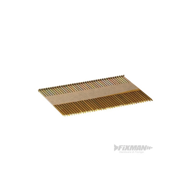 Paper-collated framing nails with 34° clipped head. Yellow passivated for weather resistance. Annular ring shank D-head nails resist pull out. Ideal for first fix timber-to-timber applications. Equivalent to Makita, DeWalt, Tacwise, and Firmahold 34° paper collated strip nails.