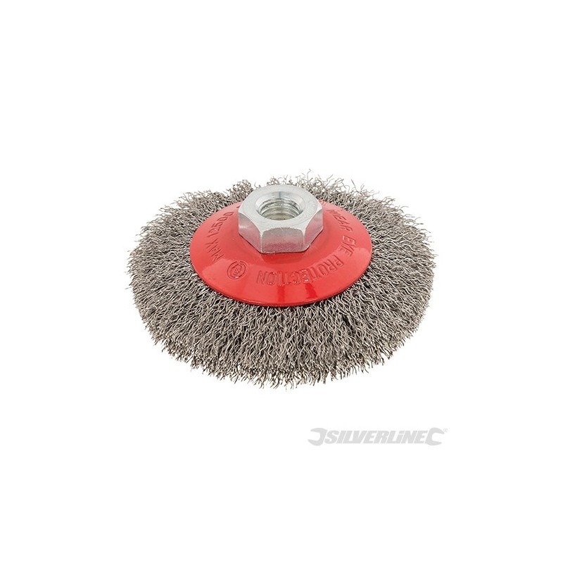 High tensile crimped stainless steel wire, 0.3mm diameter, for rust and paint removal, descaling, deburring and preparation of welding seams. For metal and stone working, cleaning, surface preparation and fabrication tasks. Use with angle grinders. M14 x 2 female thread. Max 12,500rpm.