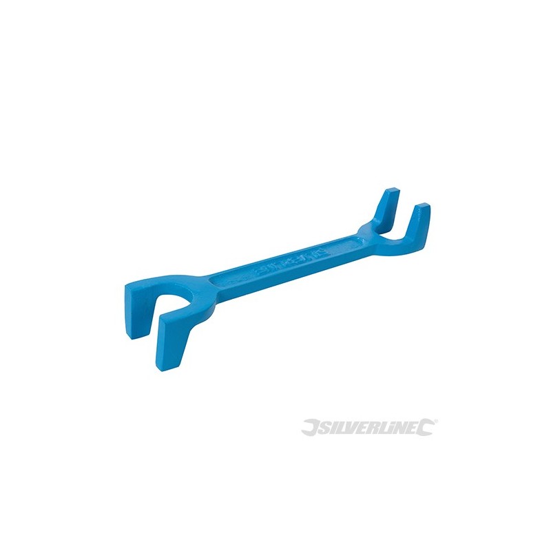 Double-ended cast iron wrench with 27mm and 32mm sides to fit standard 15mm and 22mm fittings (1/2 and 7/8) of back nuts and union nuts of pillar and bath taps behind basins, sinks and baths. Use in horizontally/vertically confined areas. Grips on smooth, oily and wet surfaces. Corrosion-resistant finish. Length 250mm.